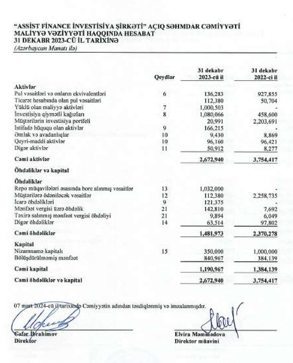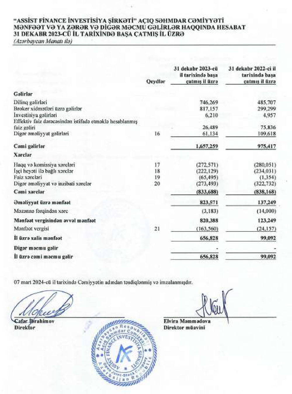 “Assist Finance İnvestisiya Şirkəti" ASC 2023-cü ili 657 min manat xalis mənfəət ilə başa vurub. Şirkət 2022-ci ili 99 min manat xalis mənfəət ilə bağlamışdı. Beləliklə, “Assist Finance İnvestisiya Şirkəti"nin xalis mənfəəti 2023-cü ildə 2022-ci illə müqayisədə 6,7 dəfə artıb.