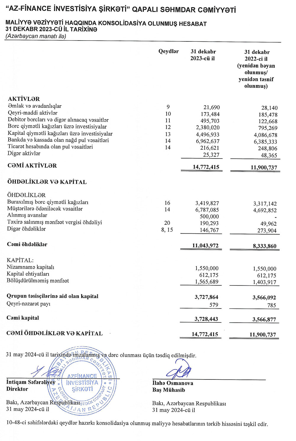 Ötən “AzFinance İnvestisiya Şirkəti” QSC cəmi aktivləri 2 milyon 872 min manat və ya 24,1% artaraq 31 dekabr 2023-cü il tarixində 14 milyon 772 min manata çatıb. Aktivlərdəki artım borc qiymətli kağızları üzrə investisiyaların 3 dəfə artaraq 2 milyon 380 min manata yüksəlməsilə əlaqədardır.