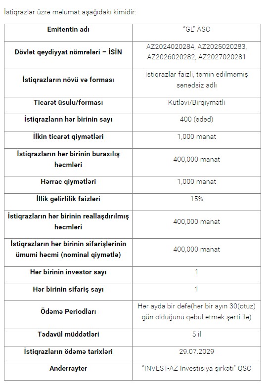 29 iyul 2024-cü il tarixində Bakı Fond Birjasında “GL” ASC-nin istiqrazlarının yerləşdirilməsi üzrə hərrac yekunlaşıb.