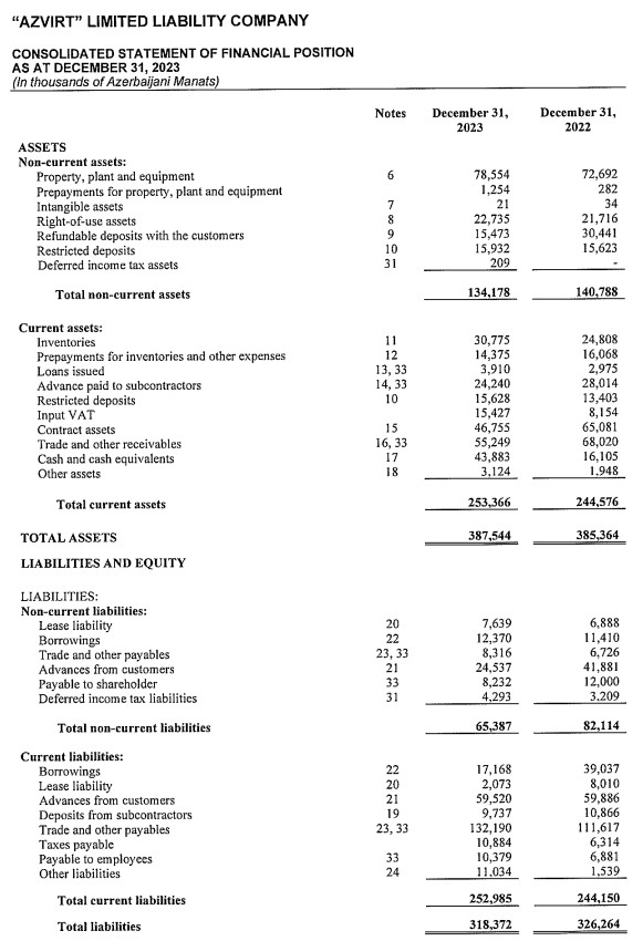 31 dekabr 2023-cü il tarixində "AzVirt" MMC 387 milyon 544 min manat cəmi aktivlərə malik olub.