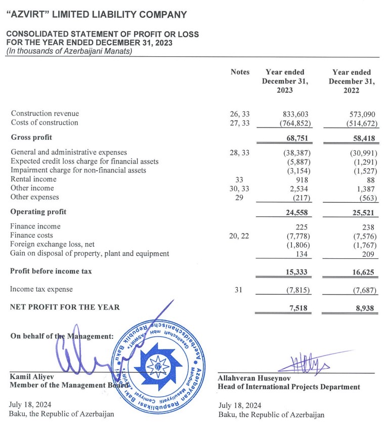 Marja.az xəbər verir ki, "AzVirt" MMC-nn tikinti işlərindən gəliri (dövriyyəsi) 2022-ci ildə 573 milyon 90 min manat ikən, 2023-cü ildə 833 milyon 603 min manata yüksəlib (260 milyon 513 min manat və ya 45,5% artıb).