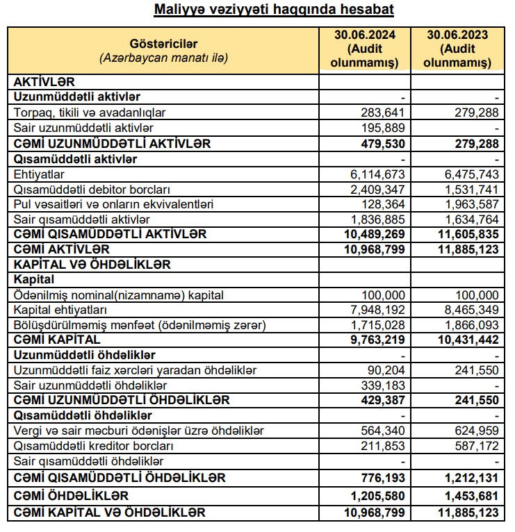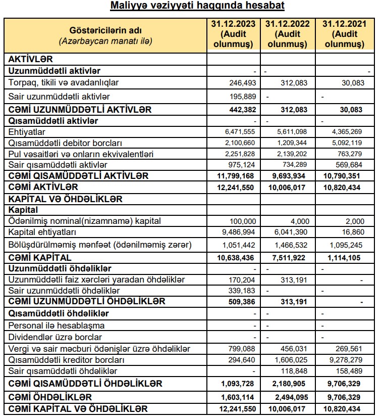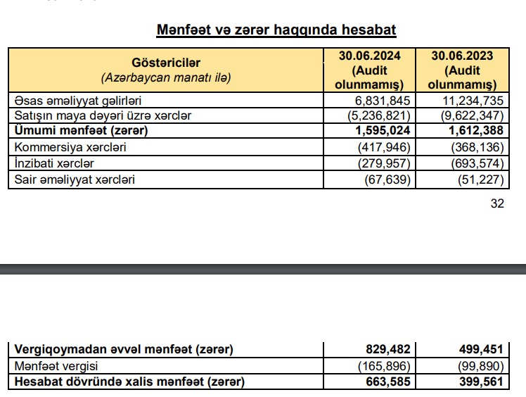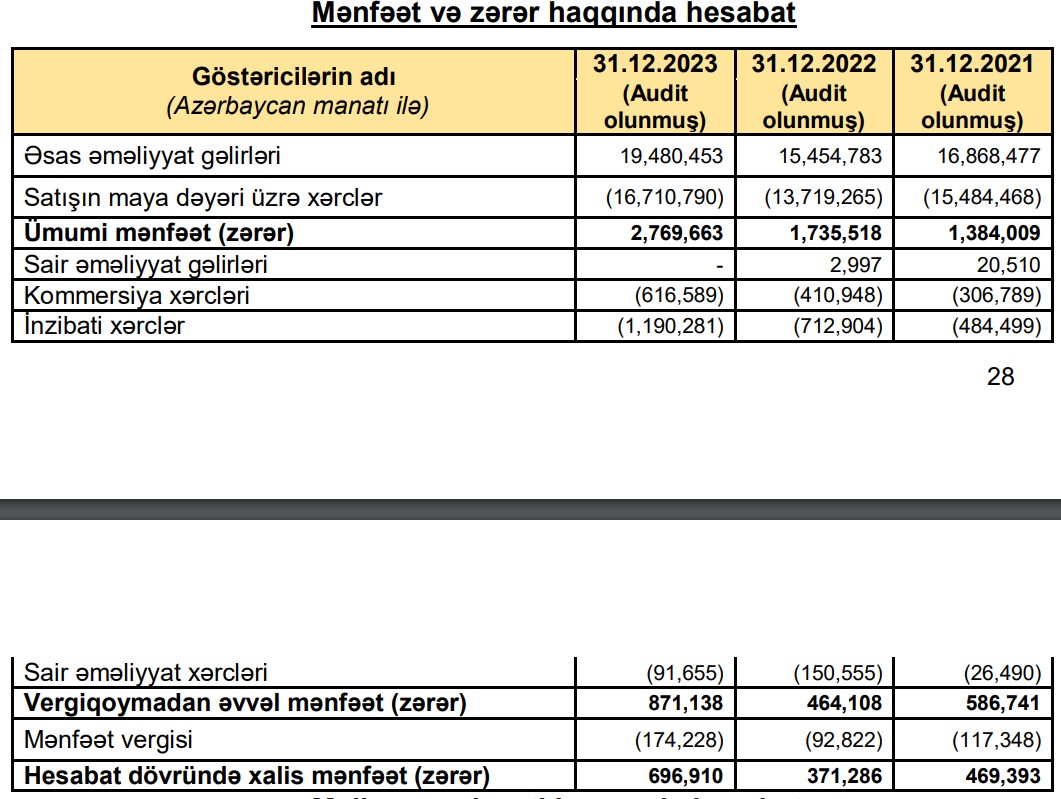 Şirkət 2023-cü ildə 19 milyon 480 min manatlıq satışa qarşı 697 min manat xalis mənfəət əld edib.