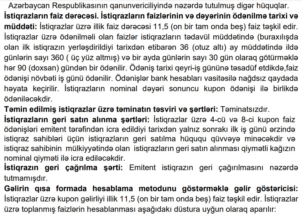 Faizli, təminatsız, sənədsiz, adlı istiqrazlar üzrə illik faiz dərəcəsi 11,5%, tədavül müddəti 36 aydır. İstiqraz ürə faiz gəlirləri hər 90 gündən bir ödəniləcəkdir.