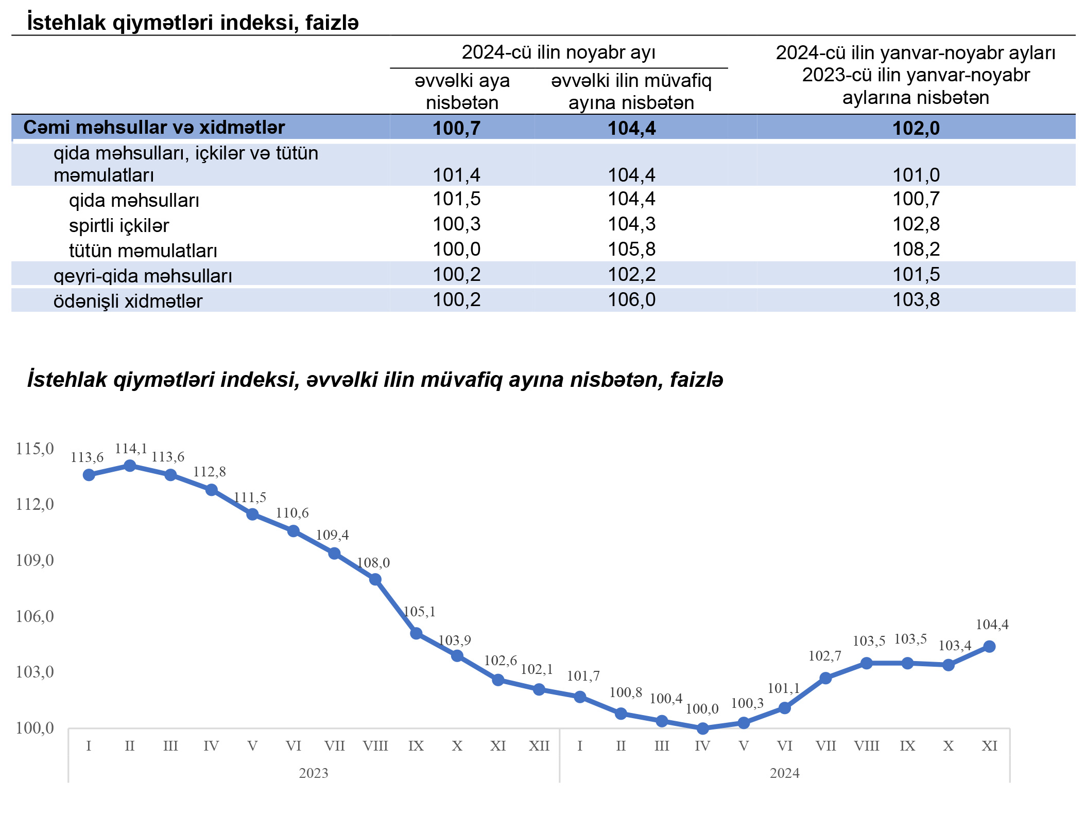Qeyd edilib ki, 2024-cü ilin noyabr ayında istehlak qiymətləri indeksi 2023-cü ilin noyabr ayına nisbətən 4,4 faiz, o cümlədən qida məhsulları, içkilər və tütün məmulatları üzrə 4,4 faiz, qeyri-qida məhsulları üzrə 2,2 faiz, əhaliyə göstərilmiş ödənişli xidmətlər üzrə 6 faiz artıb. 2024-cü ilin noyabr ayında istehlak qiymətləri indeksi əvvəlki aya nisbətən 0,7 faiz, yanvar-noyabr aylarında isə əvvəlki ilin müvafiq dövrünə nisbətən 2 faiz yüksəlib.