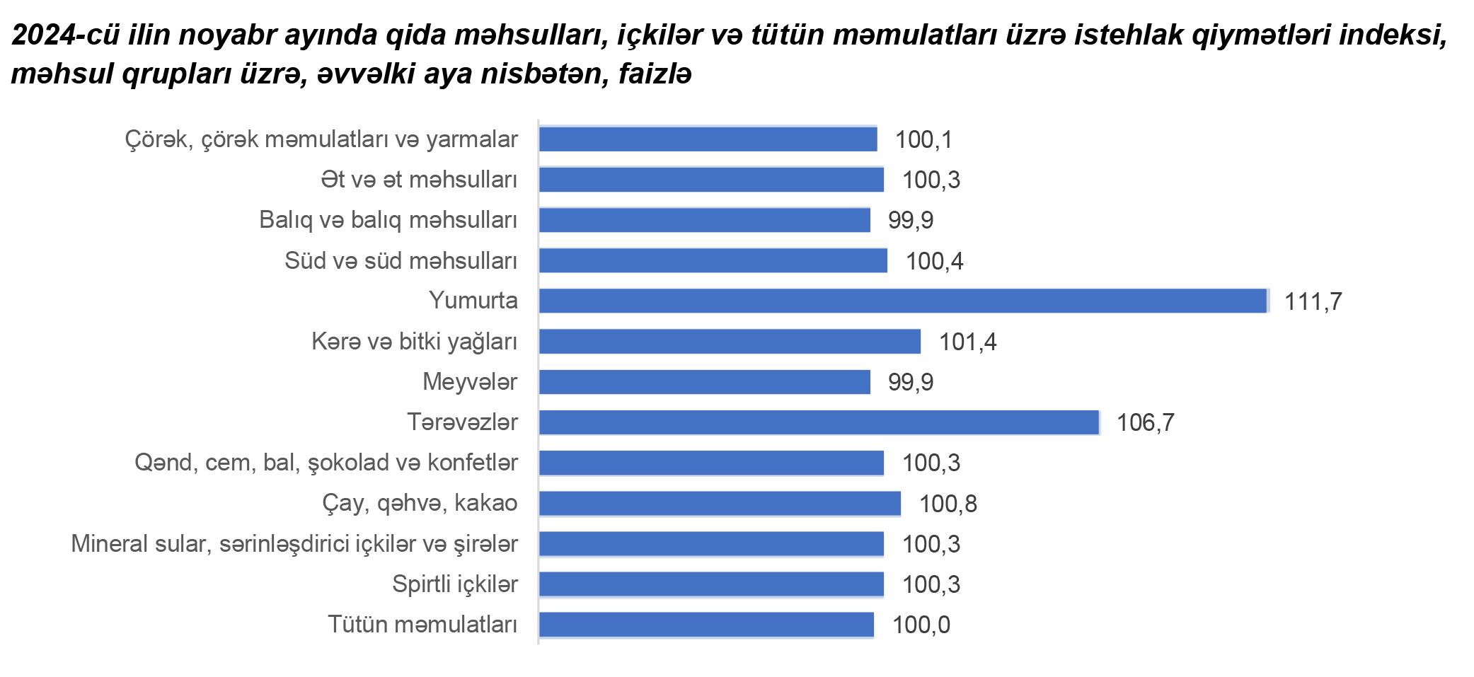 Qeyd edilib ki, 2024-cü ilin noyabr ayında qida məhsulları, içkilər və tütün məmulatları üzrə istehlak qiymətləri indeksi əvvəlki aya nisbətən 1,4 faiz, yanvar-noyabr aylarında isə əvvəlki ilin müvafiq dövrünə nisbətən 1 faiz artıb.