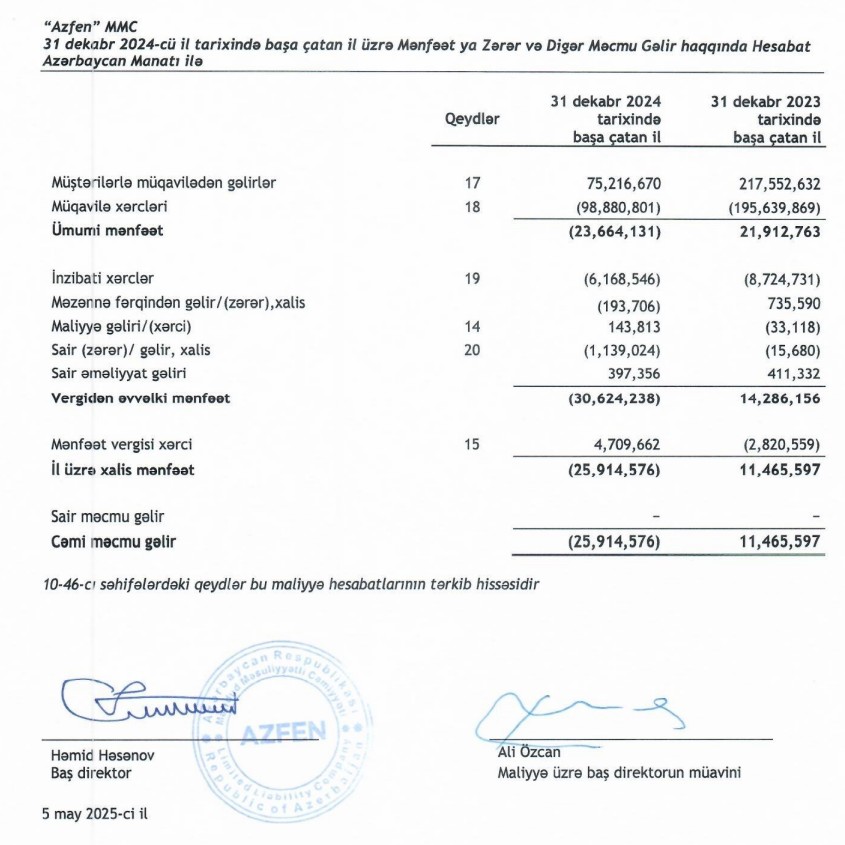 "Azfen" MMC 2024-cü ili 25 milyon 915 min manat xalis zərər ilə başa vurub. Halbuki, Şirkət 2023-cü ili 11 milyon 466 min manat xalis mənfəət ilə bağlamışdı.