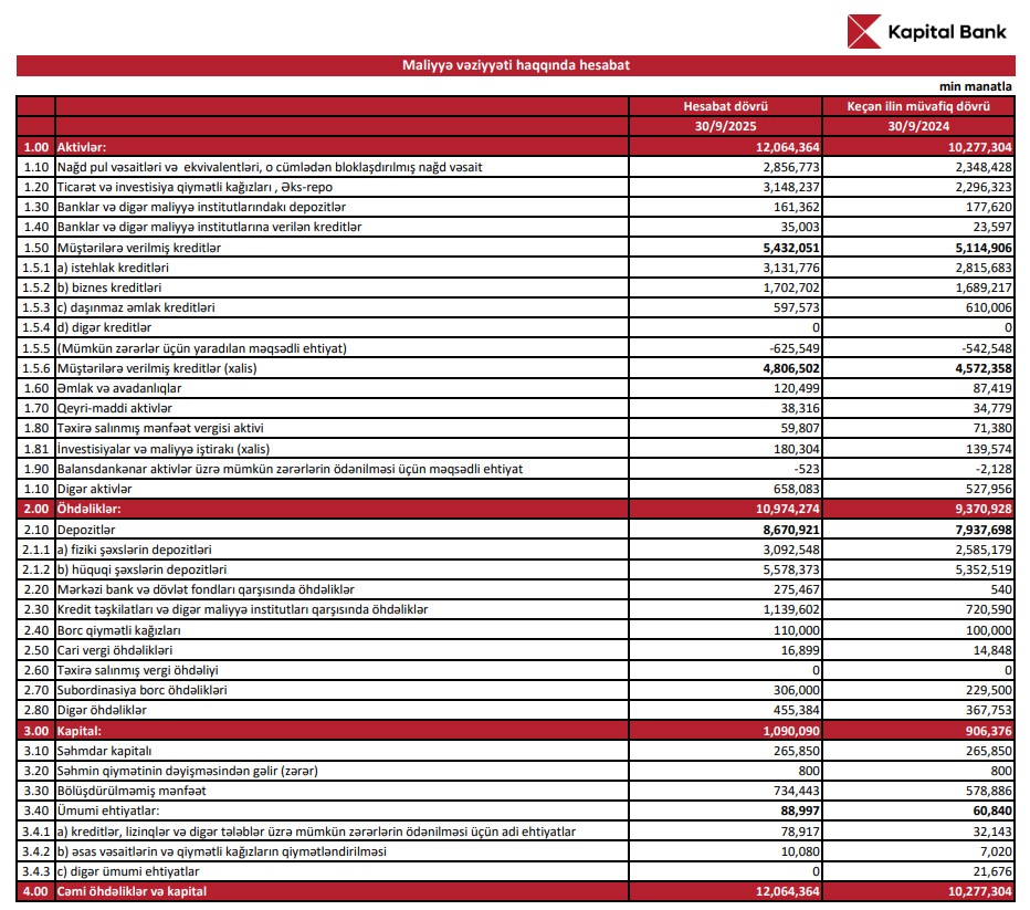 Kapital Bank böyüməkdə davam edir. Bankın həm gəlirləri, həm də aktivləri artıb. Bank 2025-ci ilin 9 ayında “mənfəət yarışında” da ön yerlərdən birini tutur.