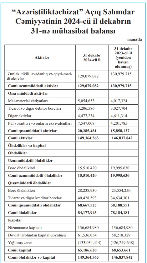 "Azəristiliktəchizat" ASC 2024-cü ili 6 milyon 784 min manat zərərlə başa vurub. Bu, 2023-cü illə müqayisədə 30,7 % azdır.