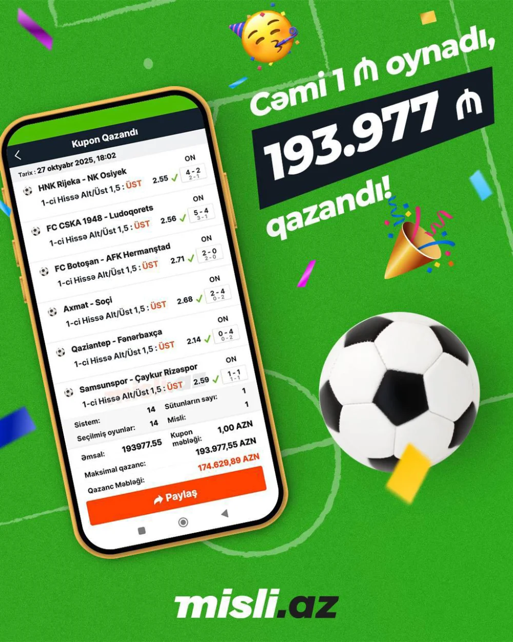 Misli.az-da böyük uduş: 1 manatlıq mərc 194 min manat qazandırıb