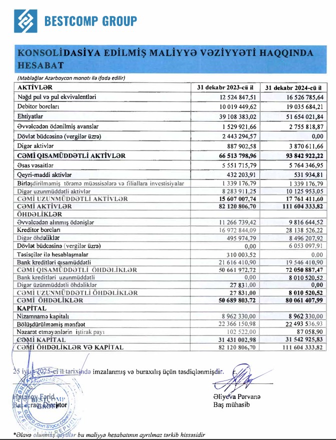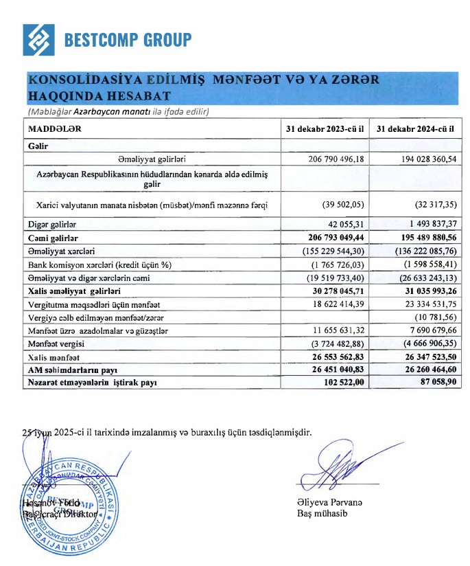 Marja.az xəbər verir ki, 2023-cü ildə "Bestcomp Group"un satışdan gəlirləri (əsas əməliyyat gəlirləri) 206 milyon 790 min manat ikən, 2024-cü ildə 194 milyon 28 min manat təşkil edib (12 milyon 762 min manat və ya 6,6% azalıb). Şirkətin digər gəlirləri isə 35 dəfədən çox artaraq 42 min manatdan 1 milyon 494 min manata qalxıb.