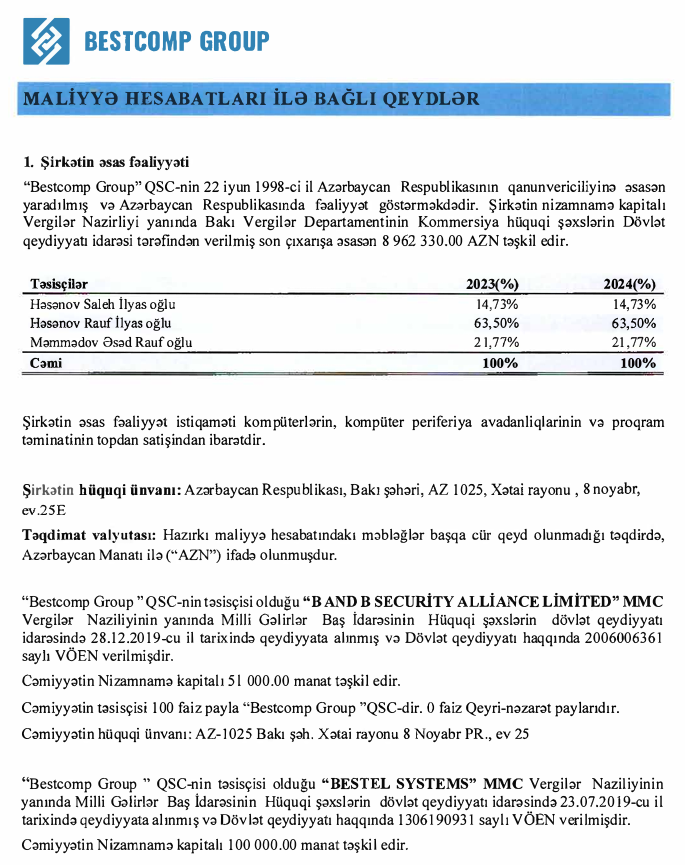 Qeyd edək ki, 22 iyun 1998-ci ildə dövlət qeydiyyatına alınmış "Bestcomp Group" QSC-nin 8 milyon 962 min 330 manat nizamnamə kapitalının 63,50%-i Həsənov Rauf İlyas oğluna, 14,73%-i Həsənov Saleh İlyas oğluna və 21,77%-i Məmmədov Əsəd Rauf oğluna məxsusdur.