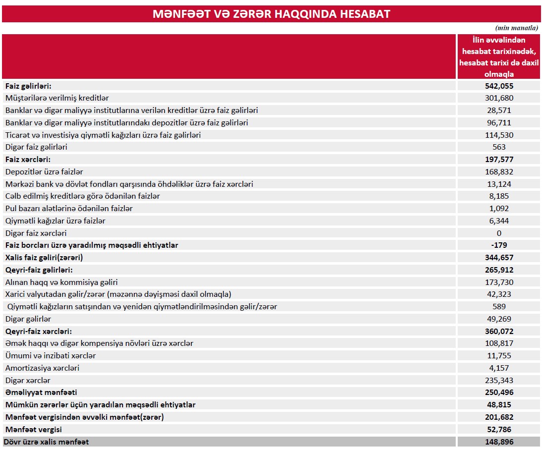Eyni zamanda, qeyri-faiz gəlirləri 265 milyon 912 min manat olub ki, bu da illik müqayisədə 14 milyon 697 min manat və ya 5,8 faiz artım deməkdir. Komissiya gəlirlərinin və bank xidmətlərindən daxilolmaların artması qeyri-faiz gəlirlərinin sabitliyini qoruyub.