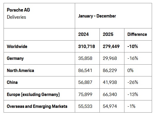 Volkswagen-in lüks markası olan Porsche 2025-ci ildə 279 min 449 avtomobil təhvil verib. Satışlardakı azalmaya əsasən Çin və Almaniya səbəb olub.