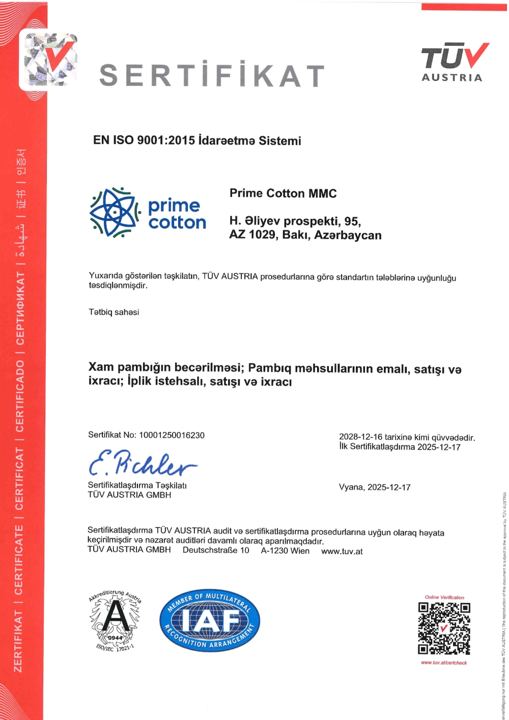 Sertifikatlaşdırma prosesi beynəlxalq səviyyədə yüksək nüfuza malik “TÜV Austria Azərbaycan” şirkəti tərəfindən həyata keçirilmişdir. Yeni əldə olunan sertifikatlar “Prime Cotton” MMC-də keyfiyyət, əməyin mühafizəsi, sağlamlıq və ətraf mühit üzrə proseslərin vahid idarəetmə sistemi çərçivəsində qurulduğunu və davamlı təkmilləşdirildiyini təsdiqləyir.
