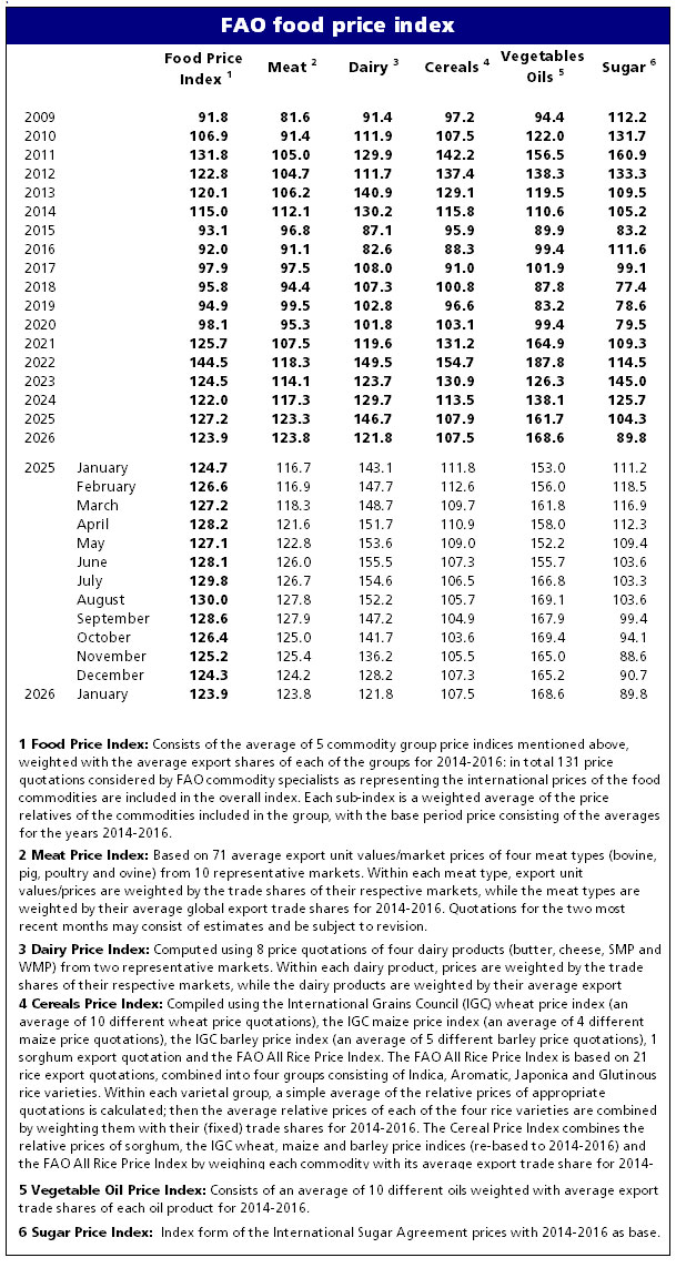 Birləşmiş Millətlər Təşkilatının Kənd Təsərrüfatı Təşkilatının (FAO-nun) Ərzaq Qiymətləri İndeksi 2026-cı ilin yanvarında süd məhsulları, ət və şəkər qiymətlərinin azalması səbəbindən ardıcıl beşinci ay düşübə