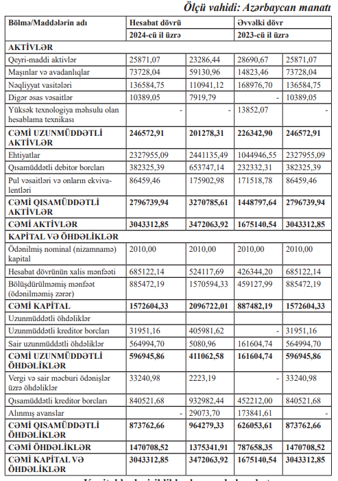 “Zirə Gülçülük” Qapalı Səhmdar Cəmiyyətinin 31 dekabr 2024-cü il tarixə maliyyə vəziyyəti haqqında hesabat