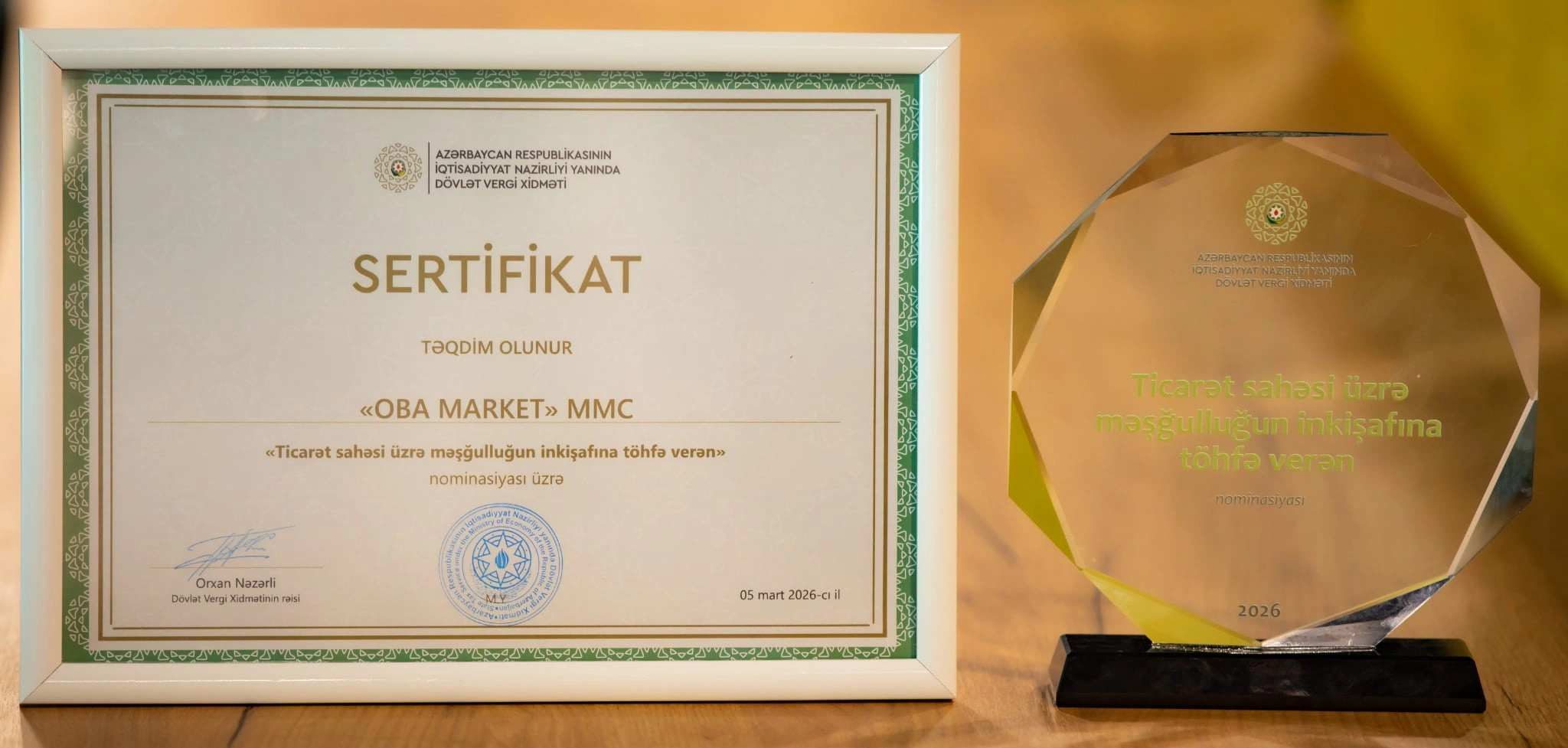 Bu mükafat “OBA” marketlər şəbəkəsinin ölkə iqtisadiyyatına verdiyi töhfənin və məşğulluğun artırılması istiqamətində gördüyü işlərin yüksək qiymətləndirilməsi kimi dəyərləndirilir.