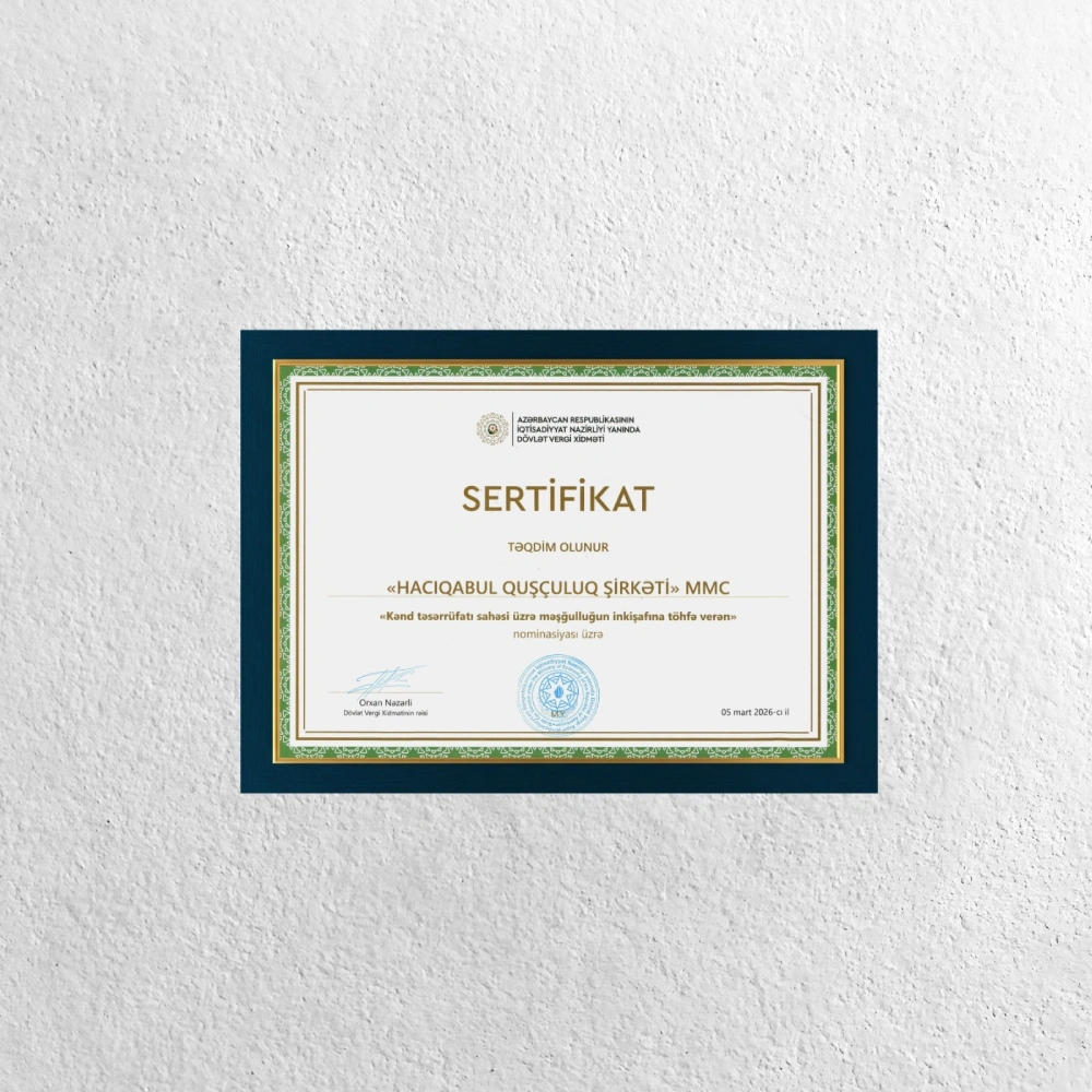 Hacıqabul Quşçuluq Şirkəti kənd təsərrüfatı sahəsi üzrə məşğulluğun inkişafına verdiyi əvəzsiz töhfələrə görə xüsusi mükafata layiq görülüb.