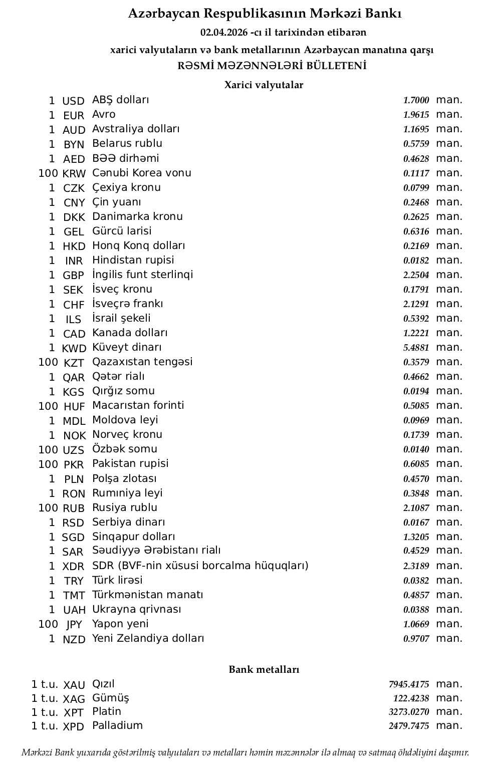 Rəsmi məzənnələr açıqlandı 02.04.2026 tarixindən etibarənRəsmi məzənnələr açıqlandı