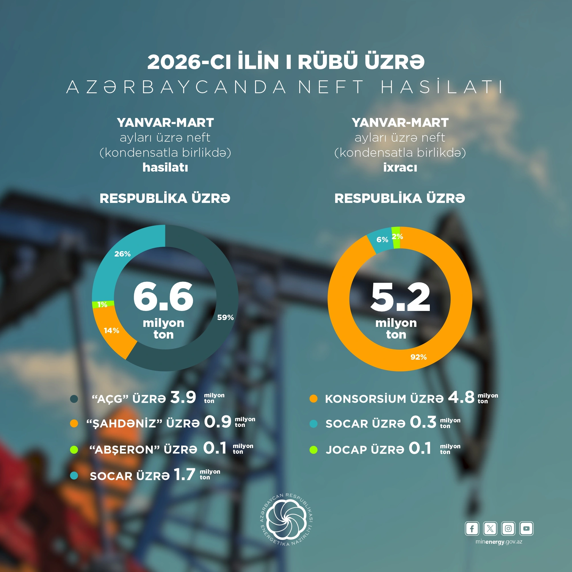 2026-cı ilin yanvar-mart ayları üzrə operativ məlumatlara əsasən, respublikada 6,6 milyon ton neft (kondensatla birlikdə) hasil edilib.