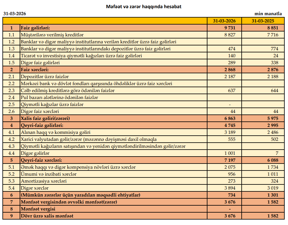 Bank 2025-ci ilin ilk rübünü 1 milyon 582 min manat xalis mənfəət ilə bağlamışdı.