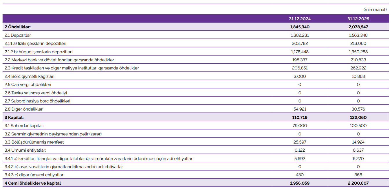 Bankın yaydığı press-relizdə bildirilir ki, 01 aprel 2026-cı il tarixinə Bankın aktivləri 2,2 milyard manata çatıb. Müqayisə üçün, ötən ilin eyni dövründə bu göstərici 1,9 milyard manat təşkil edirdi. Kredit portfeli 814,7 milyon manata yüksələrək illik müqayisədə 8 milyon manat artıb.