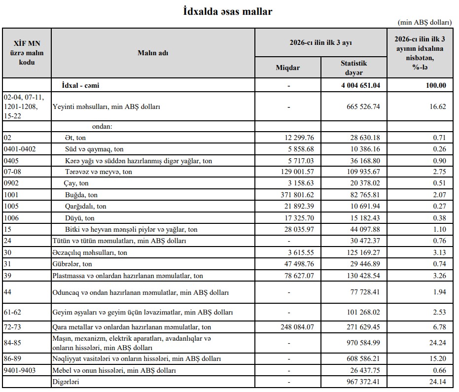 Beləliklə, Azərbaycana yeyinti məhsullarının idxal 2026-ci ilin birinci rübündə ötən ilin eyni dövrü ilə müqayisədə 31 milyon 768 min dollar və ya 5% artıb.