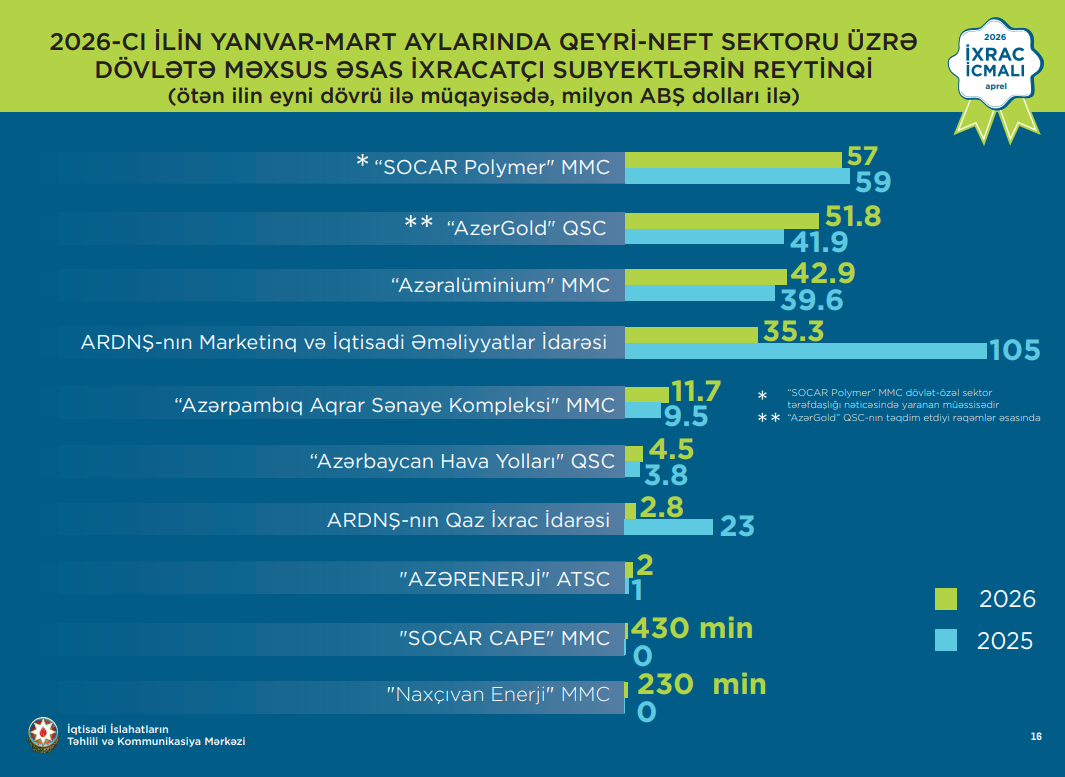 Qeyri-neft sektoru üzrə ixrac əməliyyatlarında iştirak edən dövlətə məxsus olan şirkətlərin siyahısına "SOCAR POLYMER" MMC başçılıq edir. Daha sonra bu siyahıda aşağıdakı şirkətlər təmsil olunublar: