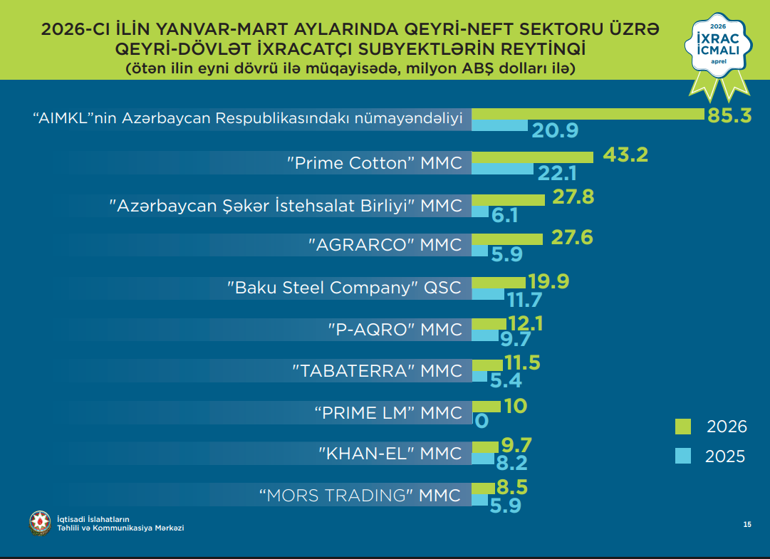 İcmala əsasən, 2026-cı ilin yanvar-mart ayları üzrə hazırlanmış qeyri-dövlət ixracatçı subyektlərin reytinqində ilk onluqda aşağıdakı şirkətlər təmsil olunublar: