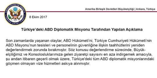 Qeyd olunur ki, buna səbəb bir neçə gün öncə ABŞ-ın İstanbuldakı baş konsulluğunun əməkdaşının həbsi olub.