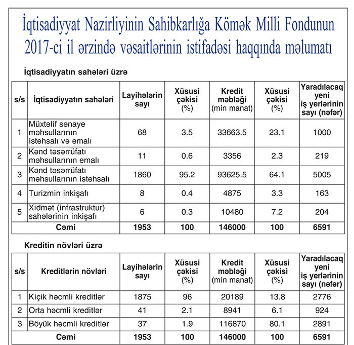 2017-ci il ərzində Sahibkarlığa Kömək Milli Fondu (SKMF) tərəfindən biznes layihələrinə 146 milyon manat güzəştli kredit ayırılıb.