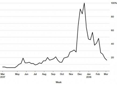 "Google Trends"in məlumatları Bitcoin axtarışlarının da 80%-dən artıq düşdüyünü göstərir. Bitcoin ən son 5 min dollar səviyyələrinə yaxın olanda bu qədər aşağı maraq görmüşdü.