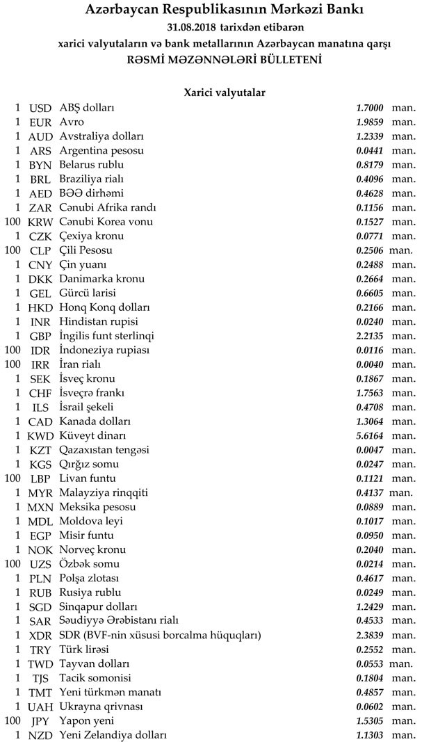 2018-ci ilin Avqust ayının 31-nə Mərkəzi Bankın açıqladığı rəsmi Dollar/Manat məzənnəsi Avqust ayının 30-u ilə müqayisədə dəyişməyərək 1,7000 manat olub, Avro/manat məzənnəsi 1.9859 manata, Rubl/manat məzənnəsi isə 0,0249 manata düşüb.
