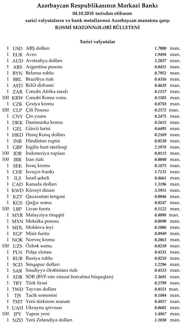 2018-ci ilin Oktyabr ayının 4-nə Mərkəzi Bankın açıqladığı rəsmi Dollar/Manat məzənnəsi Oktyabrın 3-ü ilə müqayisədə dəyişməyərək 1,7000 manat olub, Avro/manat məzənnəsi 1.9494 manata, Rubl/manat məzənnəsi isə 0,0258 manata düşüb.