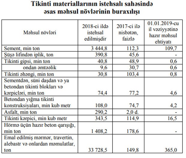 2018-ci ildə tikinti materiallarının istehsalı sahəsində fəaliyyət göstərən müəssisələr tərəfindən istehsal edilmiş məhsulun ümumi dəyəri 26,3 faiz artaraq 632,3 milyon manat təşkil etmişdir.