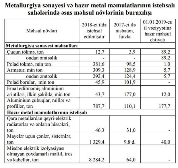 Metallurgiya sənayesi və hazır metal məmulatlarının istehsalı sahələrində 2018-ci ildə 683,4 milyon manatlıq məhsul istehsal olunmuş, metallurgiya sənayesində 11,4 faiz artım, hazır metal məmulatlarının istehsalı sahəsində 27,4 faiz azalma müşahidə olunmuşdur. İl ərzində sahə üzrə 309,3 min ton (28,9 faiz çox) armatur, 787,7 ton (10,1 faiz çox) alüminium çubuqlar, millər və profillər, 1 329,4 ton (9,8 dəfə çox) mayelər üçün çənlər, sisternlər istehsal edilmişdir.