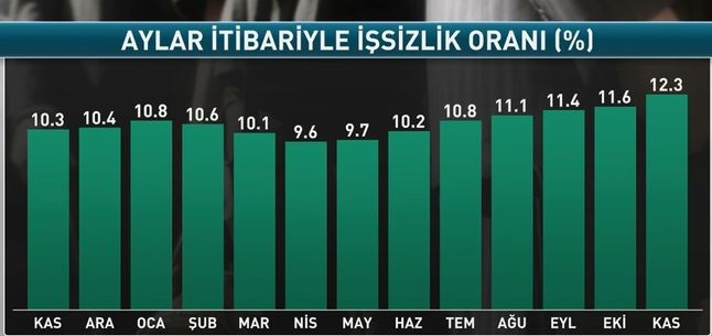 Türkiyədə işsizlik səviyyəsi 2018-ci ilin Noyabr ayında 2 bənd artaraq 12.3%-ə yüksəlib, bu 2017-ci ilin Fevral ayından bəri ən yüksək səviyyədir.