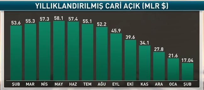 Fevral aynda Türkiyənin cari əməliyyatlar kəsiri 718 milyon dollar, 12 aylıq cari kəsir isə 17 milyard 44 milyon dollar təşkil edib.