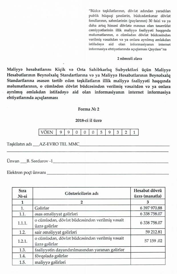 Ötən il "Azeurotel"in cəmi gəlirlərinin 99%-ni dövlət büdcəsindən verilmiş vəsait üzrə gəlirlər təşkil edib.