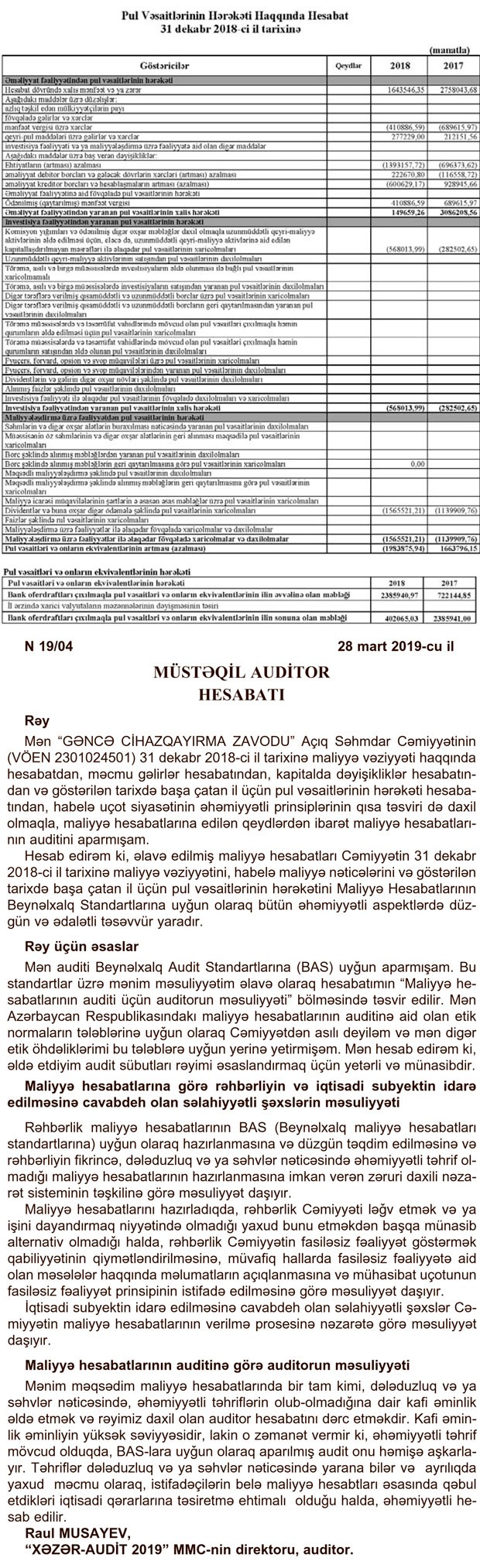 “Gəncə Cihazqayırma Zavodu” ASC 2018-ci ili 1 milyon 643 min manat xalis mənfəət ilə başa vurub. Bu, 2017-ci illə müqayisədə 1 milyon 114 min manat və ya 40,4% azdır.
