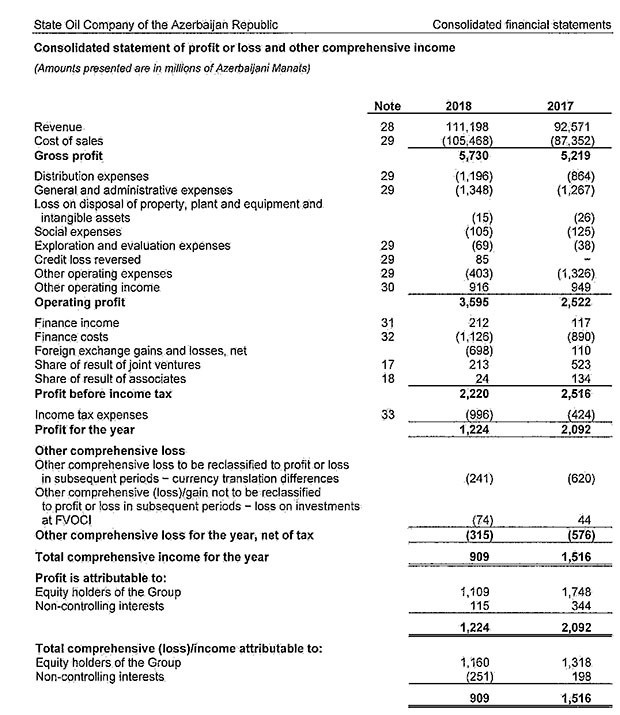 SOCAR-ın fəaliyyət göstərdiyi bəzi xarici ölkələrdə valyuta kursunun dəyişkənliyi xərclərin artımına səbəb olsa da, Şirkət 2018-ci ili mənfəətlə başa vurmağa nail olmuşdur. Beləliklə, şirkətin xalis mənfəəti 1 milyard 224 milyon manat təşkil etmişdir. Müqayisə üçün qeyd edək ki, 2017-ci ildə SOCAR 2 milyard 92 milyon manat xalis mənfəət əldə etmişdi. Beləliklə, ən böyük dövlət şirkətinin xalis mənfəəti 868 milyon manat və ya 41,5% azalıb.
