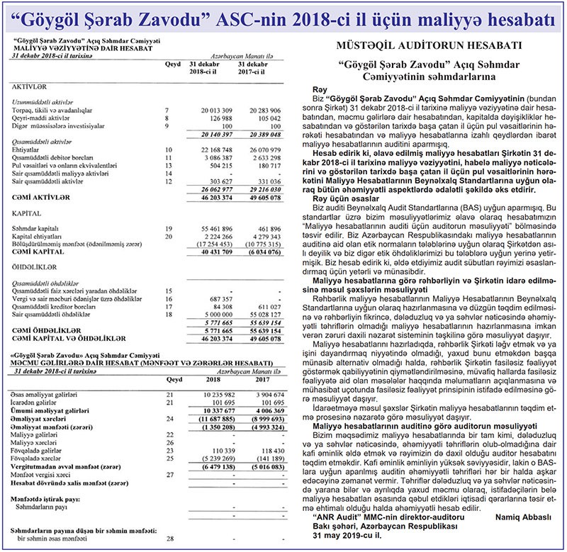 Məşhur "Xan" araqlarının istehsalçısı və ən böyük spirt istehsalçısı “Göygöl Şərab Zavodu” ASC 2018-ci ili 6 milyon 479 min manat zərər ilə başa vurub. 2017-ci illə müqayisədə ötən il ASC-nin zərəri 1 milyon 463 min manat və ya 29% artıb. Zavod 2017-ci ili 5 milyon 16 min manat zərər ilə bağlamışdı. Zərərin səbəbi xərclərin gələriləri üstələməsi və fövqəladə xərclərdir.