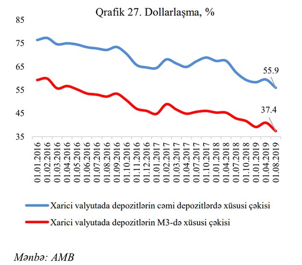 2019-cu ilin I yarımilliyində bank depozitlərinin dollarlaşma səviyyəsində azalma meyili davam etmişdir. Belə ki, ilin əvvəli ilə müqayisədə milli valyutada müddətli əmanət və depozitlər 11.7%, xarici valyutada isə 3.5% artmışdır. Xarici valyutada əmanət və depozitlərin M3 pul aqreqatında xüsusi çəkisi dövrün əvvəlində 39.1% olduğu halda, dövrün sonuna 37.4%-ə enmişdir.