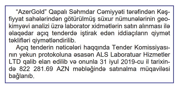 Aprel-İyun aylarında “AzərGold" tərəfindən 13 milyon 450 min manat məbləğində 6 müqavilə imzalanıb. Ən böyük məbləğli müqavilə “AZ Dağ-Mədənİstismar” MMC ilə bağlanıb. “AzərGold” 10 milyon 307 min manata kəşfiyyat buruq qazma işlərini satın alıb.