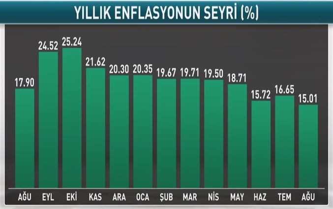 Türkiyədə istehlakçı qiymətləri Avqustda İyul ayı ilə müqayisədə 0.86%, ötən ilin Avqust ayı ilə müqayisədə isə (illik müqayisədə) 15.01% artıb. İyulda illik inflyasiya 16,65% səviyyəsində idi.