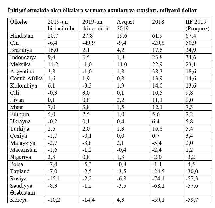 Beynəlxalq Maliyyə İnstitutunun (IIF) məlumatlarına görə, bu il inkişaf etməkdə olan ölkələrə 96,5 milyard dollarlıq xalis sərmayə girişi gözlənilir. Ən çox girişin 67,4 milyard dollarla Hindistana olacağı nəzərdə tutulur.