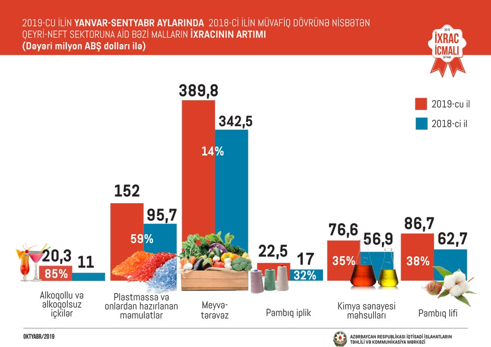 2018-ci ilin müvafiq dövrü ilə müqayisədə bu ilin yanvar-sentyabr aylarında alkoqollu və alkoqolsuz içkilərin ixracı 85 faiz, plastmassa və onlardan hazırlanan məmulatların ixracı 59 faiz, pambıq lifinin ixracı 38 faiz, kimya sənayesi məhsullarının ixracı 35 faiz, pambıq ipliyinin ixracı 32 faiz, meyvə-tərəvəzin ixracı 14 faiz, şəkər ixracı 12 faiz, elektrik enerjisinin ixracı 6 faiz artıb.