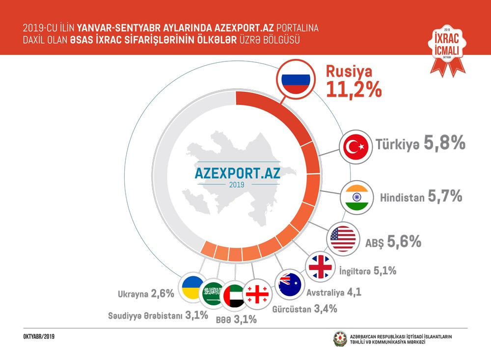 2018-ci ilin müvafiq dövrü ilə müqayisədə 2019-cu ilin 9 ayında Rusiyaya qeyri-neft ixracı 16 faiz, Türkiyəyə 10 faiz, İsveçrəyə 19 faiz, Gürcüstana 26 faiz və İtaliyaya 2,2 dəfə artıb.