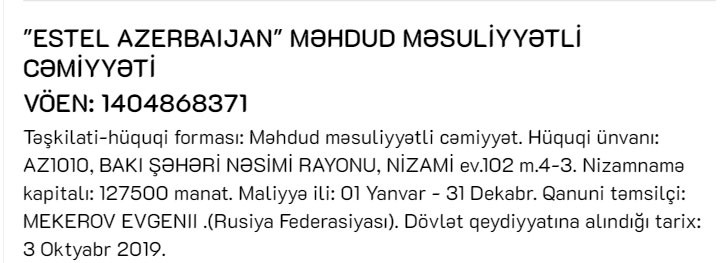 Nazirliyə istinadən xəbər görə, yeni şirkətin hüquqi ünvanı Bakı şəhəri, Nəsimi rayonu, Nizami küçəsi, ev 102, mənzil 3-4, nizamnamə kapitalı 127 500 manat, qanuni təmsilçisi isə Rusiya vətəndaşı Yevgeniy Mekerovdur.