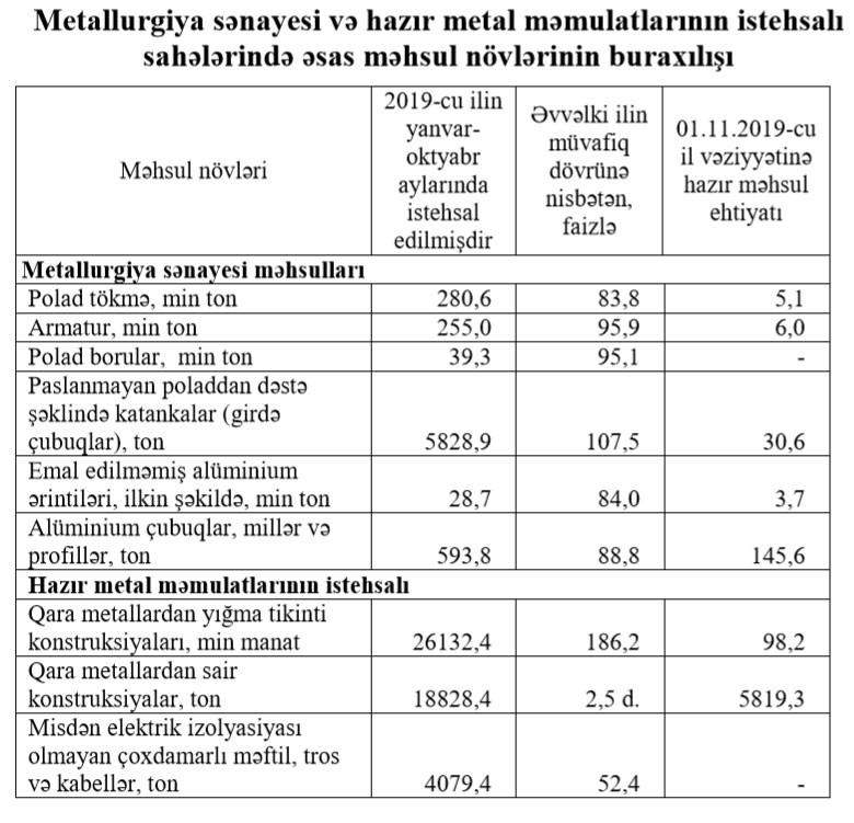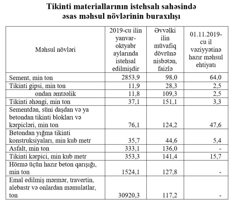 “Tikinti materiallarının istehsalı sahəsində fəaliyyət göstərən müəssisələr tərəfindən istehsal edilmiş məhsulun ümumi dəyəri 3,8 faiz artaraq 648,7 milyon manat təşkil etmişdir. Tikinti kərpicinin istehsalı 41,4 faiz, tikinti əhənginin istehsalı 51,1 faiz, hörmə üçün hazır beton qarışığının istehsalı 27,8 faiz artmış, sementin istehsalı 2,0 faiz, betondan yığma tikinti konstruksiyalarının istehsalı 55,4 faiz, tikinti gipsinin istehsalı 71,7 faiz azalmışdır”,- Komitənin aylıq hesabatında deyilir.